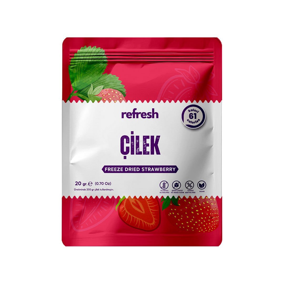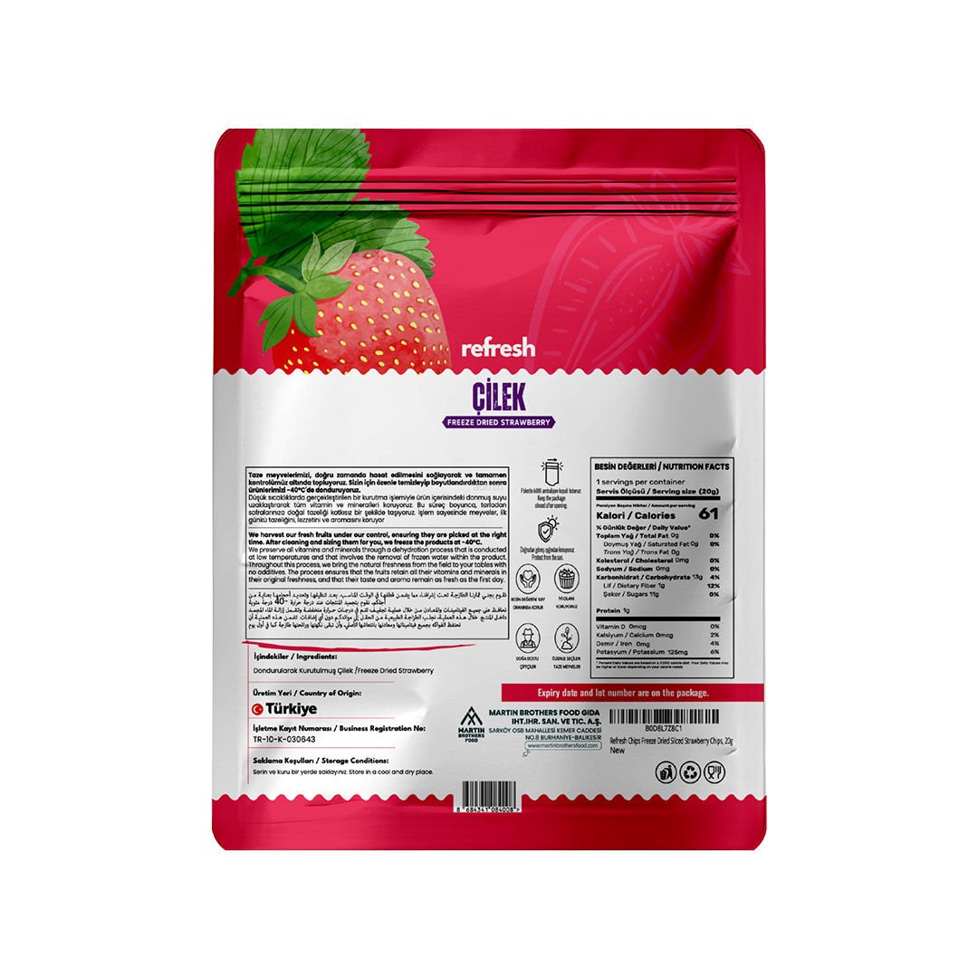 Taze çileğin tatlı ve ferahlatıcı tadı, freeze-dry teknolojisiyle hafif ve çıtır bir dokuya dönüşür. MARTİN BROTHERS FOOD’un özel yöntemiyle üretilen Çilek, meyvenin doğal aromasını ve besin değerini koruyarak, her lokmada lezzetli ve sağlıklı bir keyif sunar. Erime derdi olmadan, pratik bir şekilde çileğin tadını çıkarabilirsiniz. Öne Çıkan Özellikler Hafif ve çıtır dokuya sahiptir. Yoğun ve doğal çilek aroması sunar. Katkı maddesi ve koruyucu içermez. Gün içinde sağlıklı ve tatlı bir atıştırmalık için idealdir. İster tek başına tüketin, ister tatlılarınıza veya içeceklerinize ekleyerek çileğin zengin lezzetini keşfedin. Freeze-dried Çilek ile her an taze ve sağlıklı bir meyve keyfi yaşayın.Taze çileğin tatlı ve ferahlatıcı tadı, freeze-dry teknolojisiyle hafif ve çıtır bir dokuya dönüşür. MARTİN BROTHERS FOOD’un özel yöntemiyle üretilen Çilek, meyvenin doğal aromasını ve besin değerini koruyarak, her lokmada lezzetli ve sağlıklı bir keyif sunar. Erime derdi olmadan, pratik bir şekilde çileğin tadını çıkarabilirsiniz. Öne Çıkan Özellikler Hafif ve çıtır dokuya sahiptir. Yoğun ve doğal çilek aroması sunar. Katkı maddesi ve koruyucu içermez. Gün içinde sağlıklı ve tatlı bir atıştırmalık için idealdir. İster tek başına tüketin, ister tatlılarınıza veya içeceklerinize ekleyerek çileğin zengin lezzetini keşfedin. Freeze-dried Çilek ile her an taze ve sağlıklı bir meyve keyfi yaşayın.