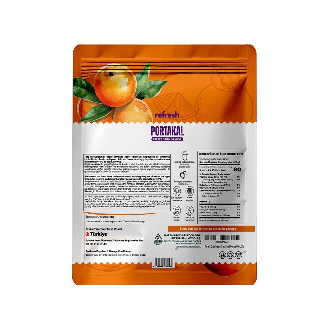 Taze ve sulu portakalın doğal asidik tatlılığı, freeze-dry teknolojisiyle hafif ve çıtır bir dokuya dönüştü. MARTİN BROTHERS FOOD’un özel yöntemiyle üretilen Portakal, meyvenin zengin aromasını ve besin değerini koruyarak, her lokmada ferahlatıcı ve tatlı bir lezzet sunar. Erime derdi olmadan, pratik bir şekilde portakal keyfini çıkarabilirsiniz. Öne Çıkan Özellikler Hafif ve çıtır dokuya sahiptir. Yoğun ve doğal portakal aroması sunar. Katkı maddesi ve koruyucu içermez. Gün içinde tatlı ve sağlıklı bir atıştırmalık için idealdir. İster tek başına tüketin, ister tatlılarınıza veya içeceklerinize ekleyerek portakalın ferahlatıcı tadını keşfedin. Freeze-dried Portakal ile her an taze ve sağlıklı bir meyve keyfi yaşayın.